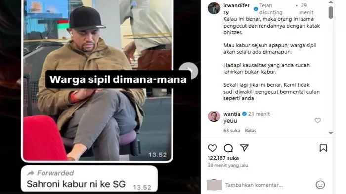 “Kalau ini benar, maka orang ini sama pengecut dan rendahnya dengan katak bhizzer. Mau kabur sejauh apapun, warga sipil akan selalu ada di manapun. Hadapi kausalitas yang anda sudah lahirkan, bukan kabur,” tulis Ferry di Instagram.