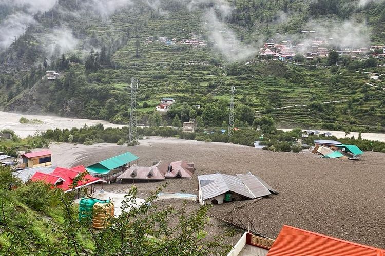 Sebagian bangunan tempat tinggal tampak terendam lumpur akibat tanah longsor besar yang dipicu hujan deras di Negara Bagian Uttarakhand, India, 5 Agustus 2025.