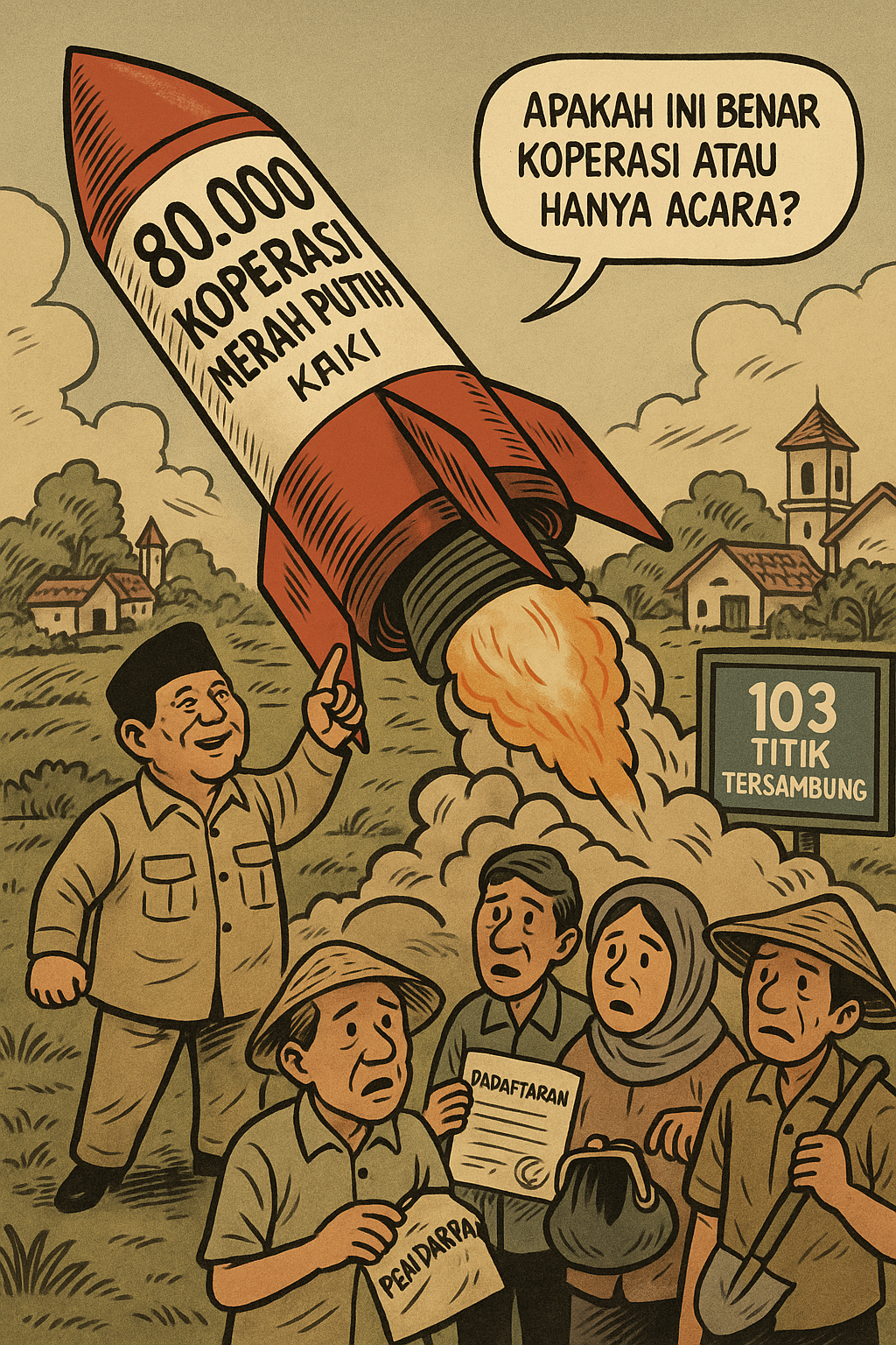 Peluncuran koperasi Merah Putih dilakukan serentak dan massif, hanya beberapa bulan setelah Presiden Prabowo dilantik. Dalam konteks politik, ini rawan dibaca sebagai pencitraan populis — tampil dekat rakyat desa, bicara ekonomi kerakyatan, tapi tanpa kepastian dampak jangka panjang.