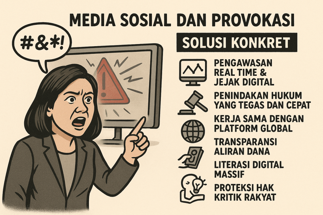 Lantas apa solusi menghadapi provokasi digital ini? Pertama, Pengawasan Real Time & Jejak Digital. Bangun pusat kendali digital (digital command center) dengan algoritma yang bisa mendeteksi lonjakan percakapan, kata kunci provokatif, hingga pola penyebaran konten secara simultan. Setiap akun dan aliran dana yang mencurigakan wajib ditelusuri jejak digitalnya, lalu diumumkan secara transparan.