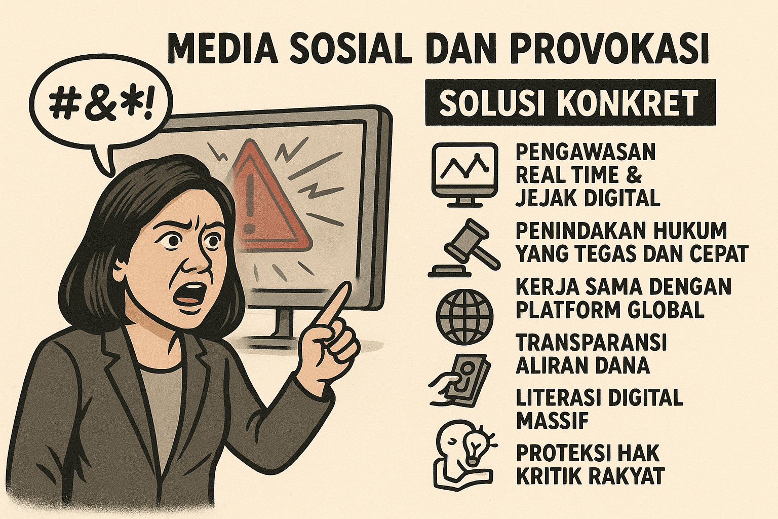 Kedua, Penindakan Hukum yang Tegas dan Cepat. Kepolisian dan kejaksaan harus membuka jalur cepat (fast track) untuk kasus provokasi digital. Jangan tunggu bulan berjalan—sehari dua hari sudah harus ada tindakan hukum. Jangan pandang bulu: baik buzzer bayaran, influencer, maupun jaringan mafia judi online, semuanya harus dihadapkan ke meja hijau.