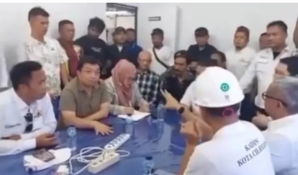 Rekaman video yang memperlihatkan sejumlah Ormas dan sejumlah orang berseragam putih yang tertulis Kadin Cilegon, Provinsi Banten. Mereka berbicara dengan perwakilan manajemen dari China Chengda Engineering. (Foto BBC)