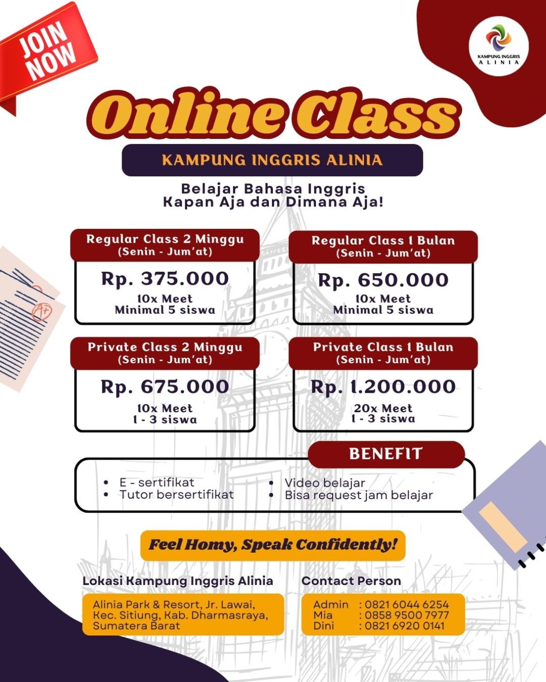 Pendaftaran sudah dibuka, dan kelas dimulai setiap minggu. Jangan lewatkan kesempatan emas ini untuk meningkatkan kemampuan Bahasa Inggris Anda dengan harga terjangkau.