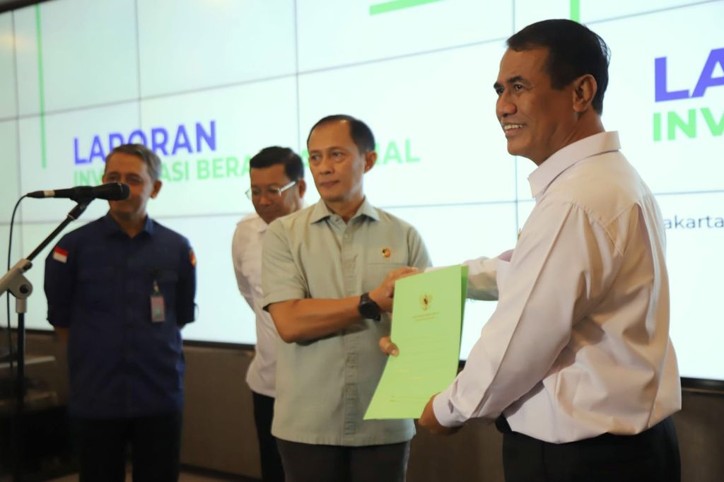 Mentan Amran Sulaiman menyerahkan laporan hasil investigasi anomali kenaikan harga beras kepada Kepala Satgas Pangan Brigjen Pol. Helfi Assegaf di kantornya, Jakarta.
