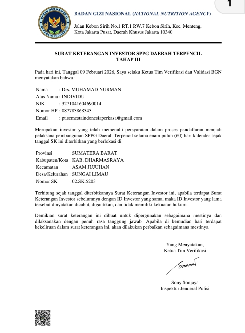 Sorotan ini muncul setelah beredarnya dokumen yang menyebutkan bahwa Drs. M. Nurman ditunjuk sebagai investor pembangunan enam dapur SPPG wilayah 3T di Kabupaten Dharmasraya. Namun berdasarkan penelusuran Tim Investigasi AliniaNews.com, dokumen penunjukan tersebut ternyata merupakan SK Tahap III, setelah sebelumnya dua SK penunjukan investor pada tahap I dan tahap II dibatalkan. Pembatalan tersebut diduga terjadi karena investor sebelumnya tidak mampu menyelesaikan pembangunan dapur SPPG sesuai dengan batas waktu yang telah ditentukan, sehingga dinilai wanprestasi terhadap komitmen pembangunan.