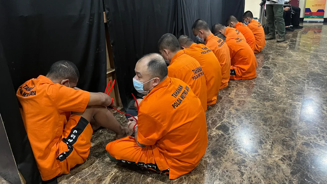 Dalam konferensi pers, Polda Metro Jaya menampilkan 15 tersangka yang mengenakan masker dan baju tahanan dengan tangan terikat kabel ties. Polisi juga memperlihatkan sejumlah barang bukti, antara lain lakban, pakaian, ikat pinggang, mobil, hingga perangkat elektronik.