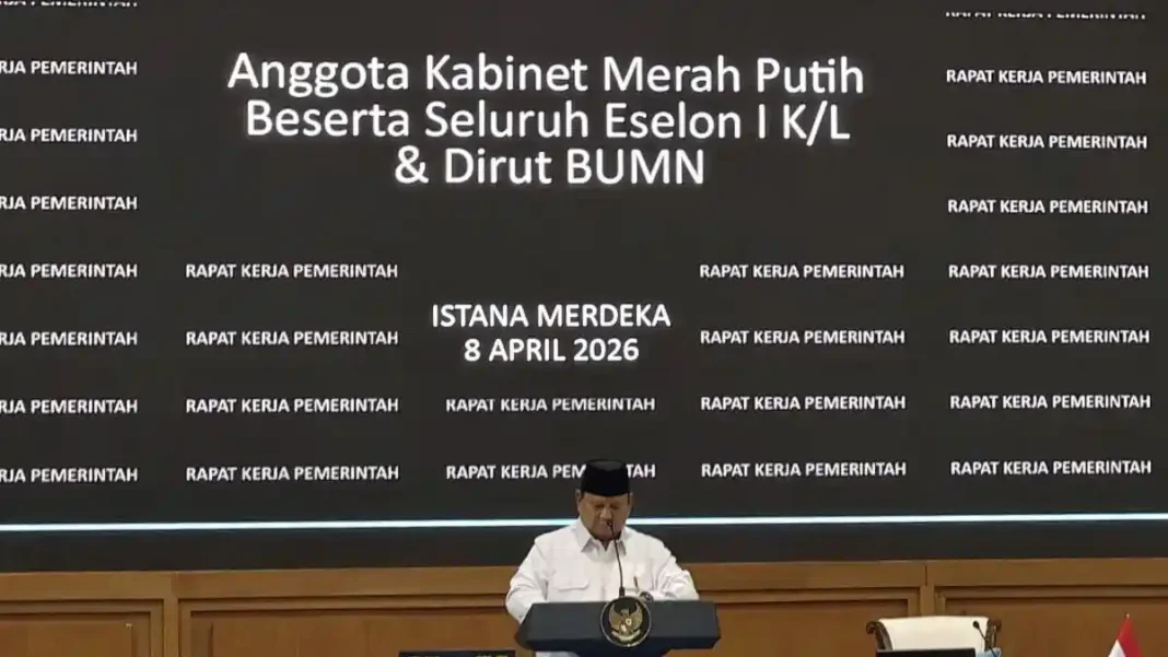 JAKARTA, ALINIANEWS.COM – Prabowo Subianto memimpin Rapat Kerja bersama jajaran Kabinet Merah Putih, pejabat eselon I kementerian/lembaga, serta para direktur utama BUMN di Halaman Tengah Istana Kepresidenan, Jakarta, Rabu (8/4/2026). Dalam pertemuan itu, sejumlah isu strategis dibahas, mulai dari dinamika geopolitik global hingga sektor pangan, energi, dan kehutanan.