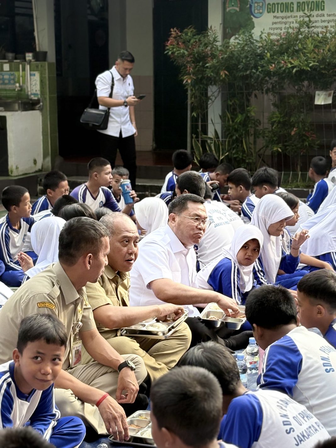 Di tengah riuh rendah itu, hadir sosok yang tidak sekadar datang untuk meninjau. Wakil Kepala Badan Gizi Nasional (BGN), Sony Sonjaya, memilih duduk bersama anak-anak, membuka ompreng yang sama, dan menyantap menu yang sama.